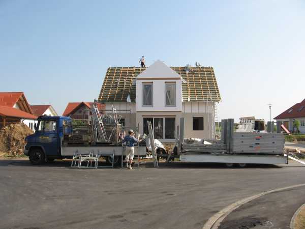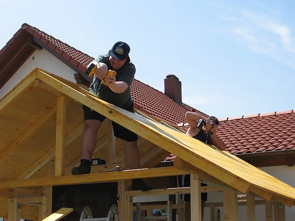 Schon cool, wie ohne Sicherung das Dach gedeckt wird, zum Glück ist insgesamt bei unserem Bau nichts passiert!