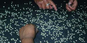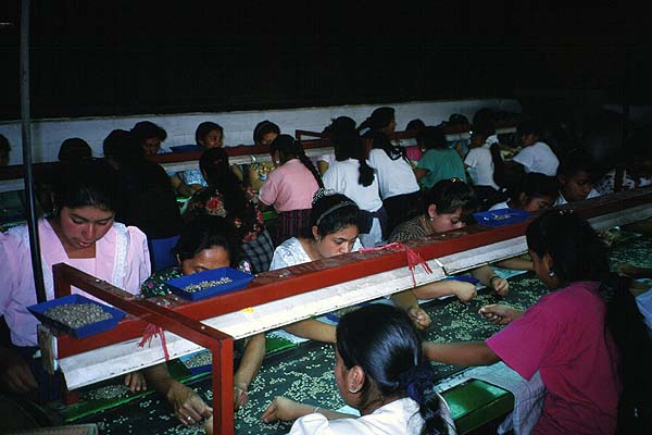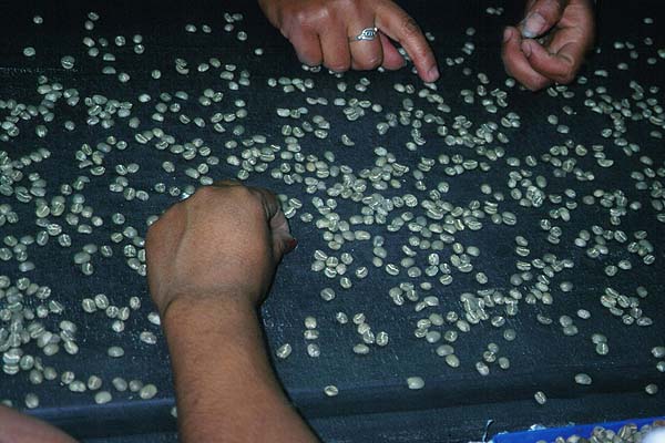 Ebenfalls in Handarbeit erfolgt das letzte Sortieren der Bohnen...